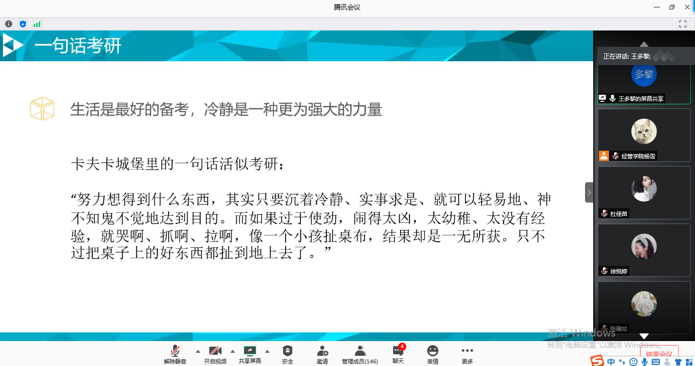 (通讯员:张安祥)6月13日晚七点,bwin必赢2020年考研分享交流会在辅导员杨雪的组织下,通过腾讯会议平台顺利进行。会议邀请到3位2016级考研录取学生代表,就院校选择、复习备考、考研心态等话题与同学们做了交流分享。学院近200余名学生参加了此次交流会。